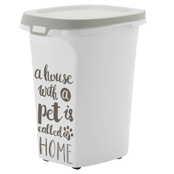 Der Moderna Futterbehälter Trendy Shorty Pet Wisdom 20 l 36,5 x 29 x 42,5 cm ist ein Vorratsbehälter aus Kunststoff für Tierfutter, mit abnehmbarem Deckel und lustigem Design. Dieser Futterbehälter ist in neutralem, modernem Weiß mit einem taupefarbenen Deckel erhältlich, der luftdicht verschließt, um das Futter Ihres Haustiers so lange wie möglich frisch zu halten. Der Zugang zum Futter erfolgt über die Klappen an der Oberseite, zum bequemen Befüllen des Behälters lässt sich jedoch auch der gesamte Deckel abnehmen. Um das Ganze abzurunden, ist der Futterbehälter mit dem Text „Ein Haus mit einem Haustier heißt ein Zuhause“ in schwarzen Designbuchstaben bedruckt.