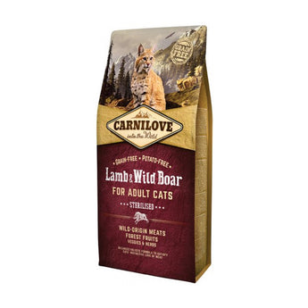 Carnilove Lamm/Wildschwein sterilisiert 400 gr ist ein getreidefreies, hochwertiges Alleinfuttermittel für sterilisierte Katzen mit Lamm und Wildschwein. Diese Brocken sind völlig frei von Kartoffeln und Getreide, da diese nicht zur natürlichen Ernährung der Wildkatze und ihrer Vorfahren gehören. Stattdessen wurden Zutaten verwendet, die den Ernährungsbedürfnissen von Katzen besser gerecht werden, nämlich ein hoher Anteil tierischer Zutaten kombiniert mit frischem Gemüse, Obst, Kräutern und Mineralstoffen. Diese enthalten wichtige Vitamine und Antioxidantien, die aufgrund der Struktur der verwendeten Proteine optimal vom Körper aufgenommen werden. Die Rezeptur dieses Futters ist besonders für sterilisierte und kastrierte Kater und Katzen geeignet: Durch den geringeren Fettgehalt bleibt das Gewicht der Katze erhalten. Alles in allem ist dieses Trockenfutter sorgfältig ausgewogen, bekömmlicher, ganzheitlich und einfach nur lecker!