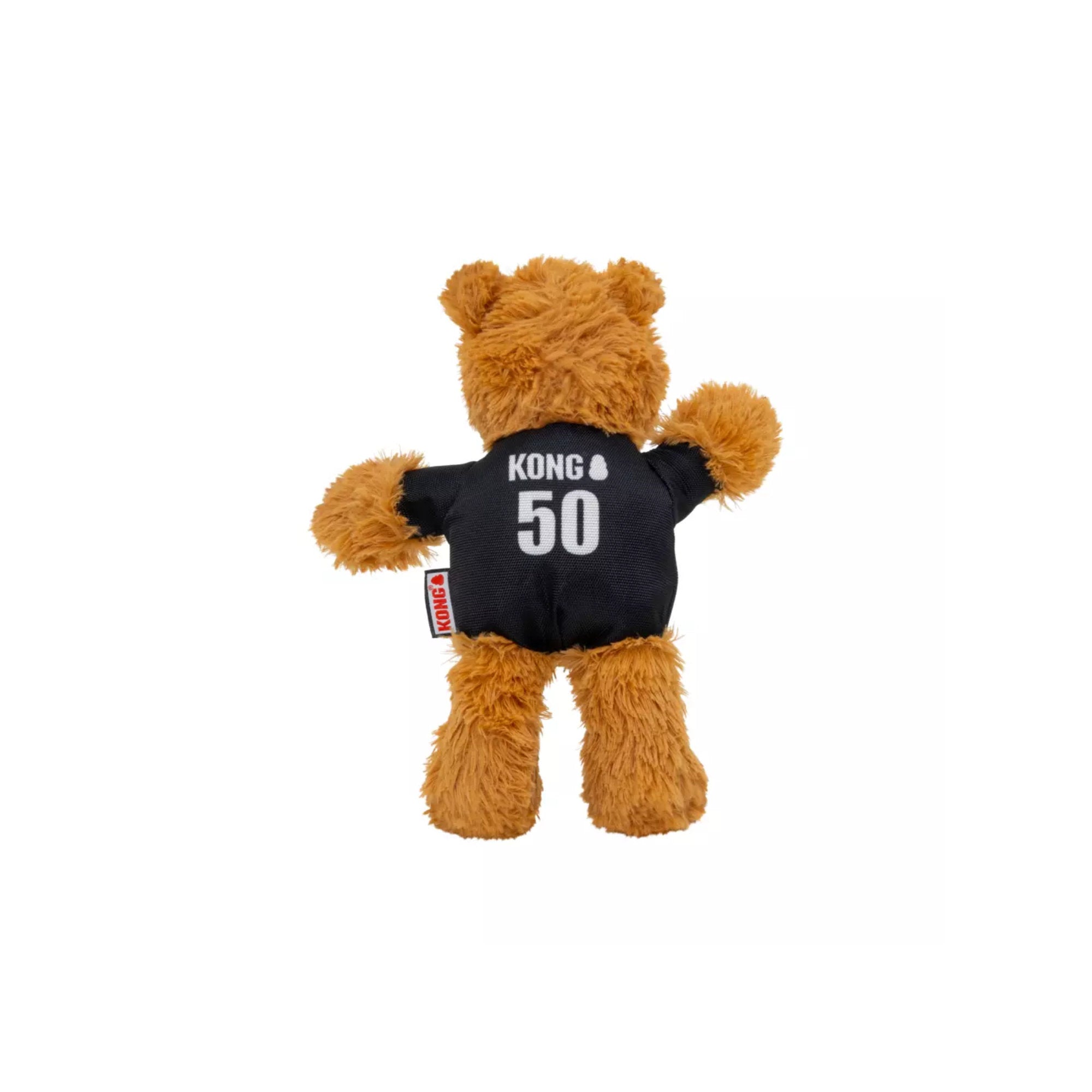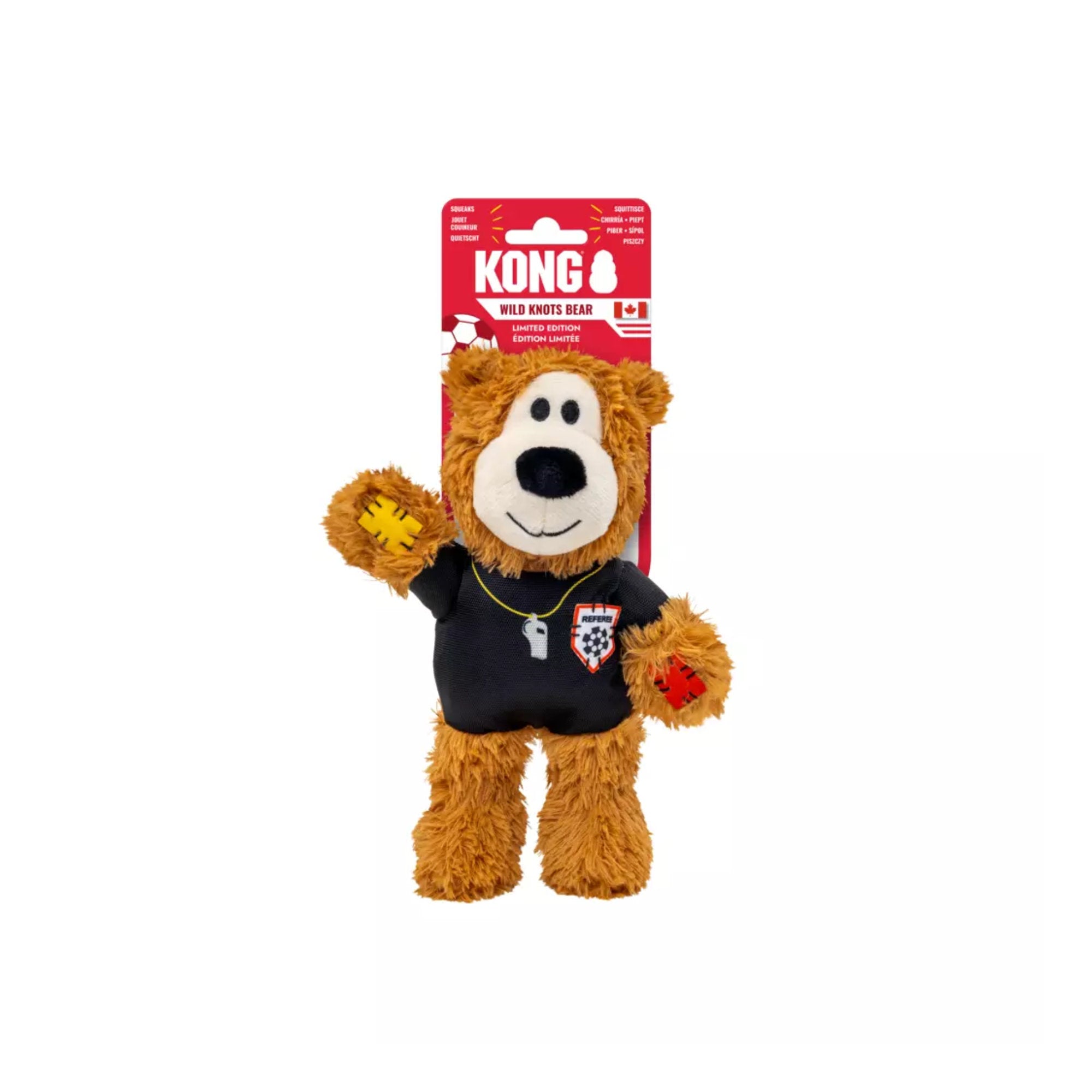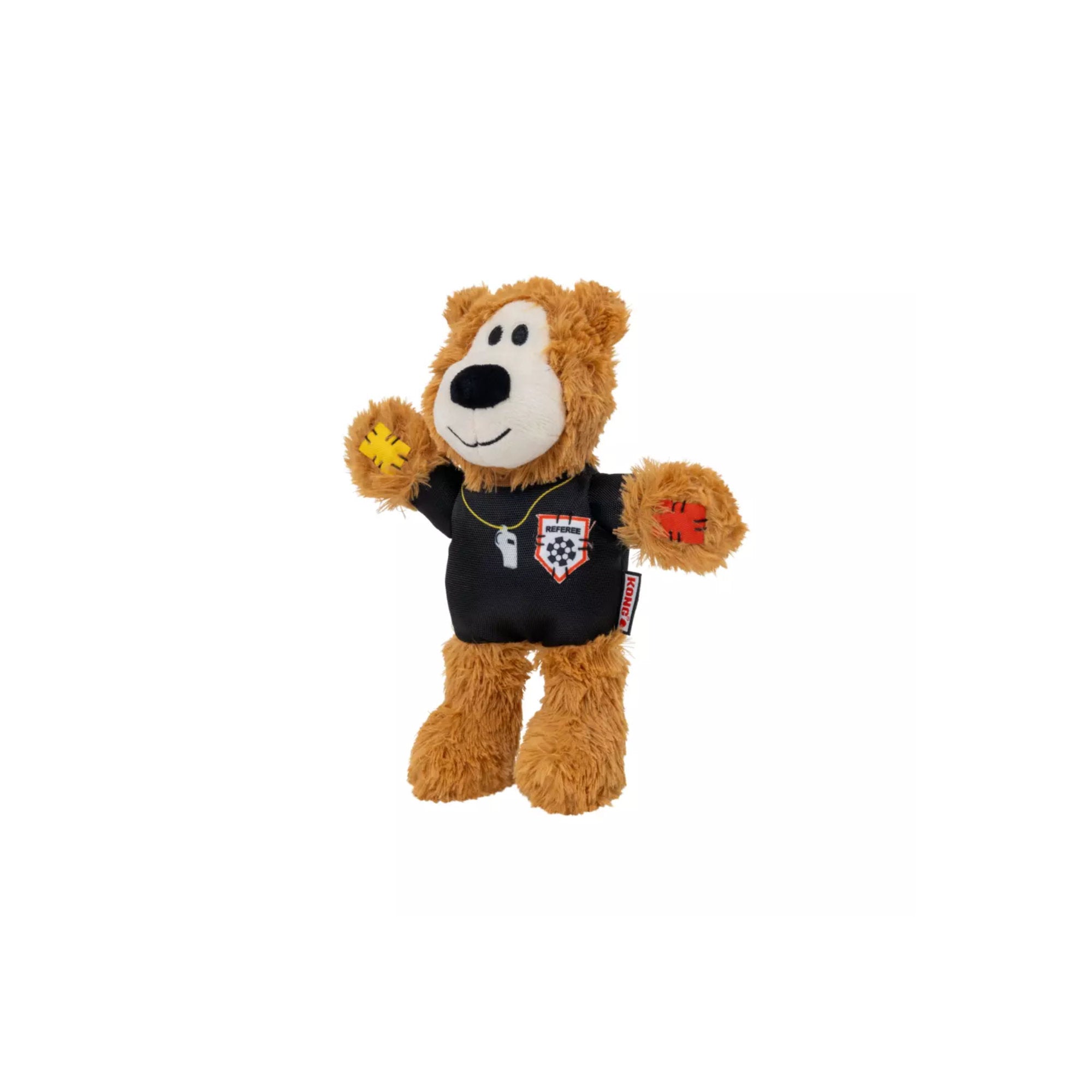 De KONG Wild Knots Sport Bear Scheidsrechter is een pluche hondenspeeltje in WK-thema, uitgevoerd als scheidsrechter met fluitje en voetbalbadge. De zachte buitenkant maakt het speeltje prettig om te dragen en te schudden, terwijl de binnenzijde voorzien is van een geknoopt touwskelet dat extra structuur geeft tijdens het spelen. De pieper in het speeltje zorgt voor extra prikkels en stimuleert interactief spel. Het scheidsrechtershirt geeft de beer een speelse en herkenbare uitstraling voor tijdens het WK.